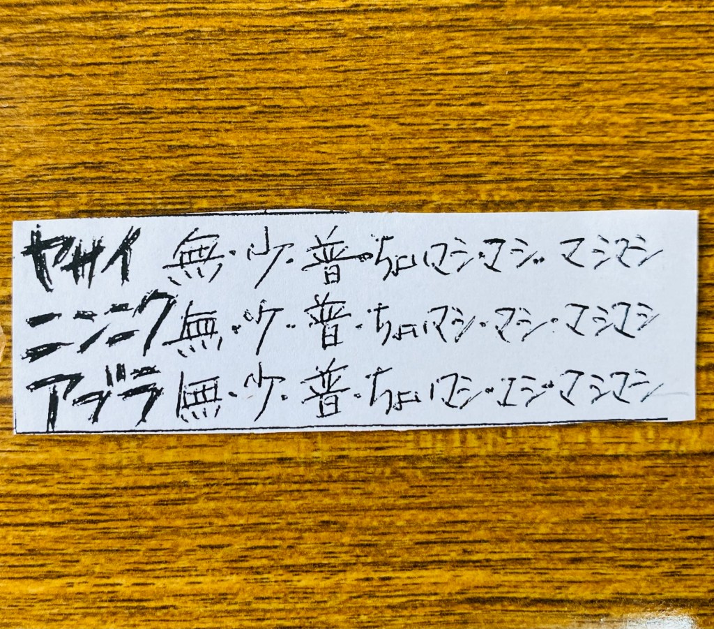テーブルにはチケットがあり、ヤサイ、ニンニク、アブラの量をお好みで選択可能。